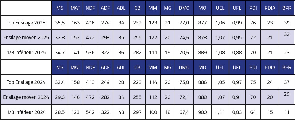 Avec l’utilisation exclusive de fourrages 2025, les densités alimentaires de ration seront par nature plus forte et les niveaux d’ingestion très certainement bons. Ainsi, l’utilisation de matière première, tel que le maïs grain ou l’orge en quantités raisonnables seront des pistes à ne pas écarter.  Le recours aux correcteurs azotés se fera en quantités plus faibles qu’en 2024 et de façon plus efficace. Moins de fibres et plus de digestibilité, c’est autant de gain sur le métabolisme de l’animal.