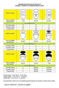 Voici les repères en fonction de l’aspect du grain et les délais avant récolte exprimés en nombre de jours nécessaires :